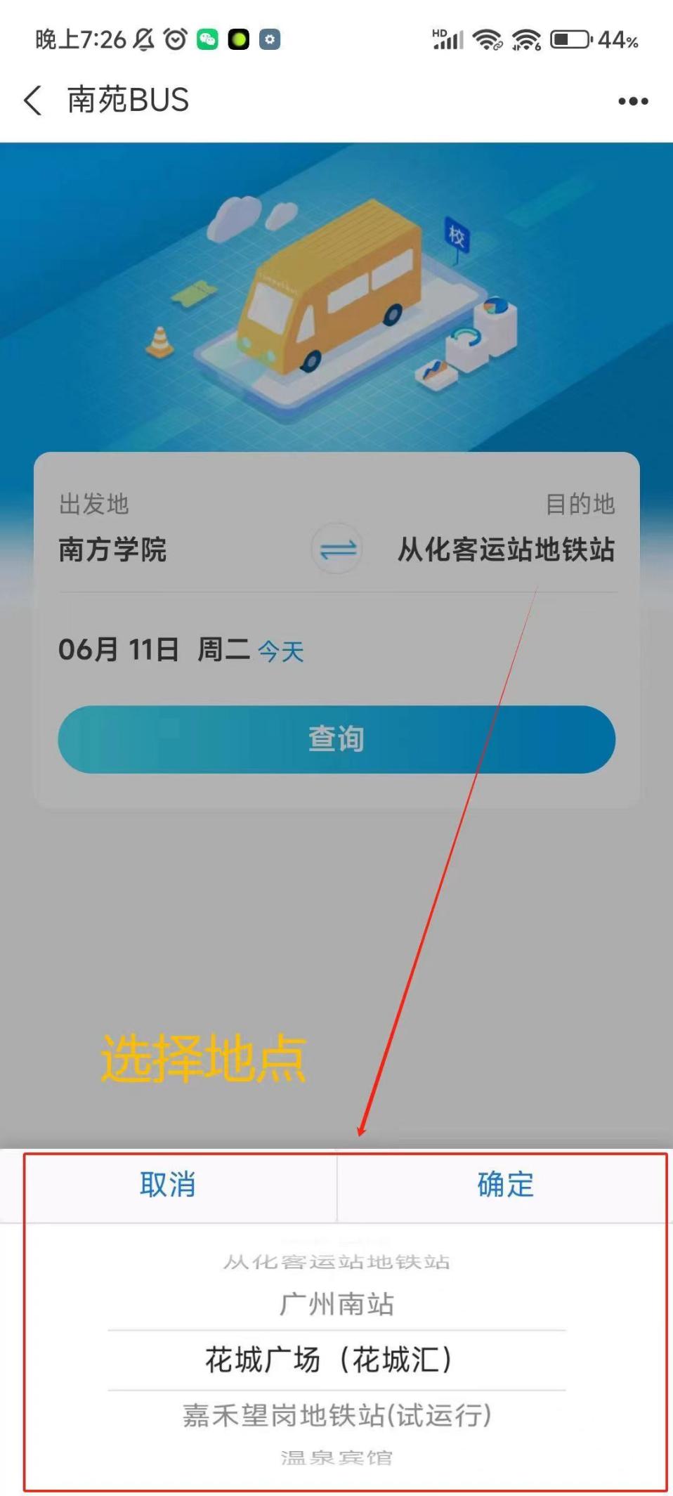 校园巴士可以到达从化地铁客运站(约30分钟)、花城广场(约70分钟)、广州南站(约90分钟)这些地点。通过选择目的地、时间就可以购票啦。