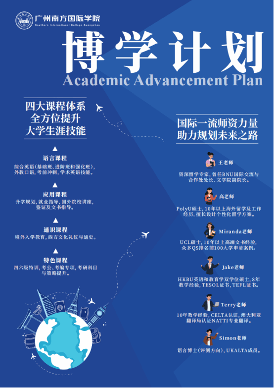 最新更新在当今全球化的时代,具备国际视野与竞争力的人才成为市场争抢的宝贵资源。为助力广州南方学院大一至大四学生提升个人背景,增强其在国际舞台上的竞争力,南方国际学院精心策划并推出全面的软实力背景提升课程。该课程旨在为学生未来的海外深造奠定坚实的专业基础,同时激发其自主学习能力,培育兼具国际思维与开阔视野的杰出人才。