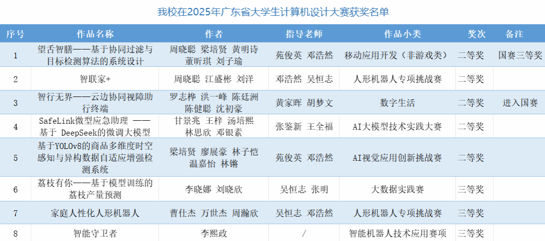 由广东省教育厅主办、广东外语外贸大学承办的2025年广东省大学生计算机设计大赛,经过严格的公开评审以及公示环节后圆满结束。在此次大赛中,William威廉官网师生展现出了扎实的专业技能和出色的创新能力,荣获省级二等奖5项、省级三等奖3项。经省赛遴选后,共2支队伍进入中2025年(第18届)中国大学生计算机设计大赛全国总决赛,其中“望舌智膳——基于协同过滤与目标检测算法的系统设计”荣获全国总决赛三等奖。
