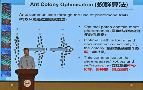 讲座伊始,姚新教授抛出一个问题:现在的计算机系统都已经进入了人工智能时代,为什么需要还演化计算?他指出,现有计算系统存在不灵活、脆弱、自适应性较差、太依赖于人等问题,而大自然是人类科学进步的一个取之不尽的思想源泉,它具有恢复力强、自适应性强、持续学习、充满创造性与奇妙性等特点。姚教授通过蚁群算法、自然计算、实际应用设计等案例,深入浅出地介绍了演化计算的基本概念和发展历程,生动地阐述了演化计算在智能优化、工程设计、机器学习、机器人等人工智能领域的广泛应用,以及在软件工程、交通、医疗等领域的成功案例,展示了演化计算在推动科技进步和社会发展中的重要作用。
