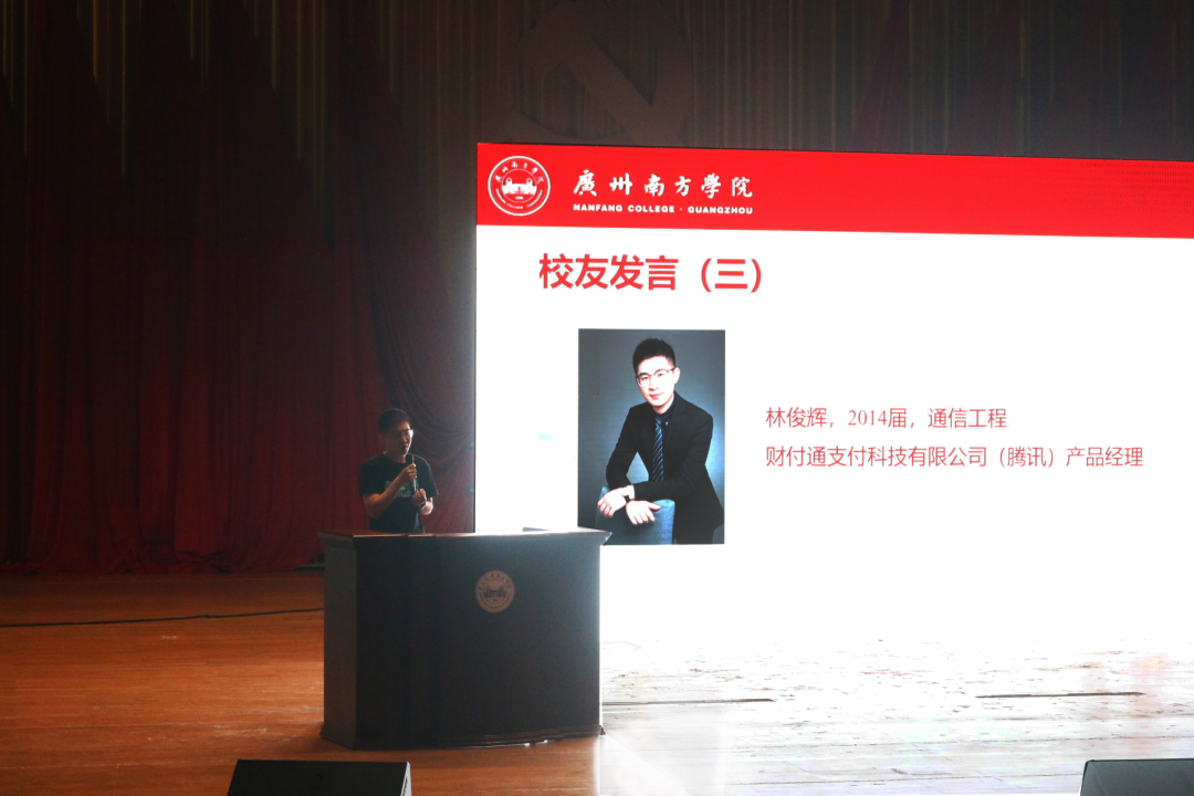 2014届校友林俊辉,通信工程专业毕业,腾讯理财通产品经理。他通过讲述工作经历,鼓励同学们要勇于竞争,同时也提醒我们在校期间可以做一点项目来提升自己的动手能力。