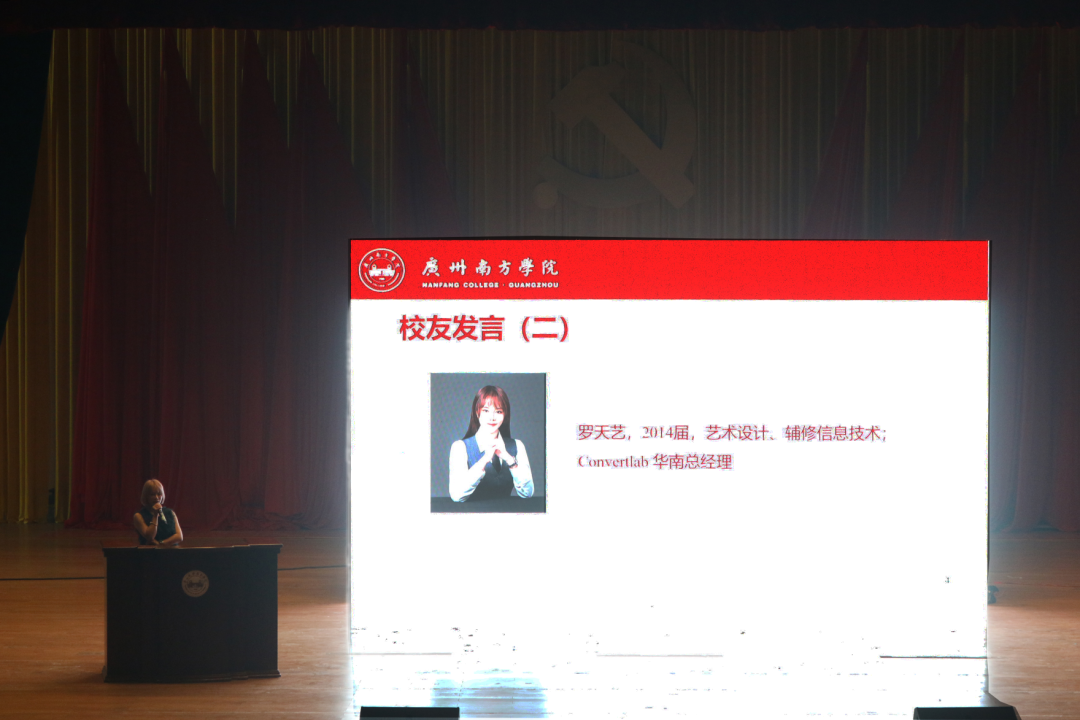 2014届校友天艺,艺术设计毕业,辅修信息技术,先进营销云企业华南负责人。她先是通过一个有趣的小视频向我们介绍了自己,讲述了她的工作经历以及创业经历,让大家明白了勇于尝试的人是不会一直输的。