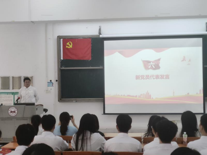 新党员杨龙飞同志代表发言,他表达了对党组织培养的感激之情以及加入党组织的光荣感和自豪感。他坚定地诠释作为一名新党员的赤诚忠心:在今后的学习生活中要加强思想引领,铸牢信仰之基;要不断追求卓越,争做学习先锋;要以行动表率,践行初心使命,做到思想上固根守魂,实践中奋发有为。
