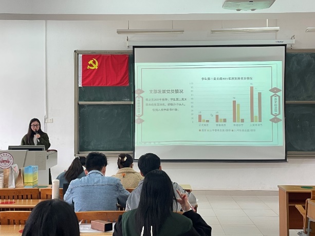 支部书记陈金涛同志对支部2021年的工作从年度发展党员情况、“三会一课”开展情况、党史学习情况、“我为群众办实事”落实情况、“党建带团建”领航情况等方面做出总结。