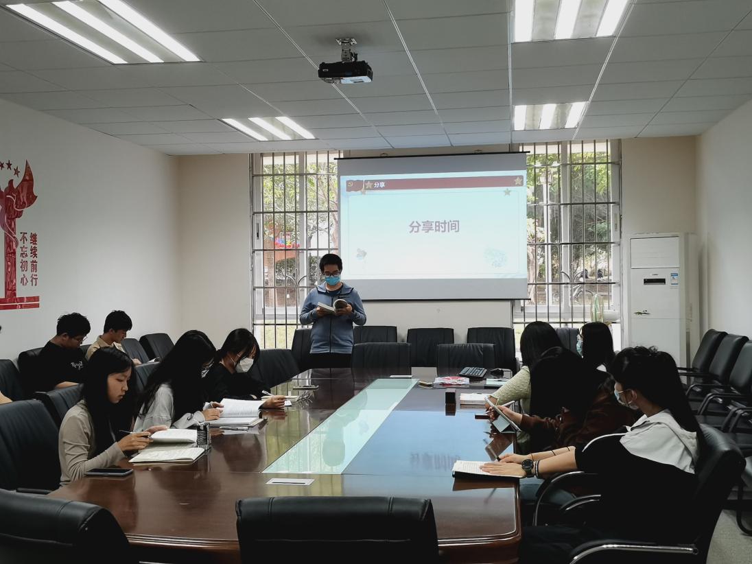 在三位党员推荐完书籍后,由14位积极分子开始分享阅读后的感想。积极分子孙瀚观赏《习近平谈治国理政(第三卷)》后有感,提及习总书记的各项决策不外乎“我将无我,不负人民”作为宗旨,写出了习总书记为创造幸福繁荣稳定昌盛的国家所做的努力;积极分子彭嘉怡观《论中国共产党历史》有感,即我们要认真学习党史,无论我们走得多远,都不要忘记来时路。勿忘初心,牢记使命!