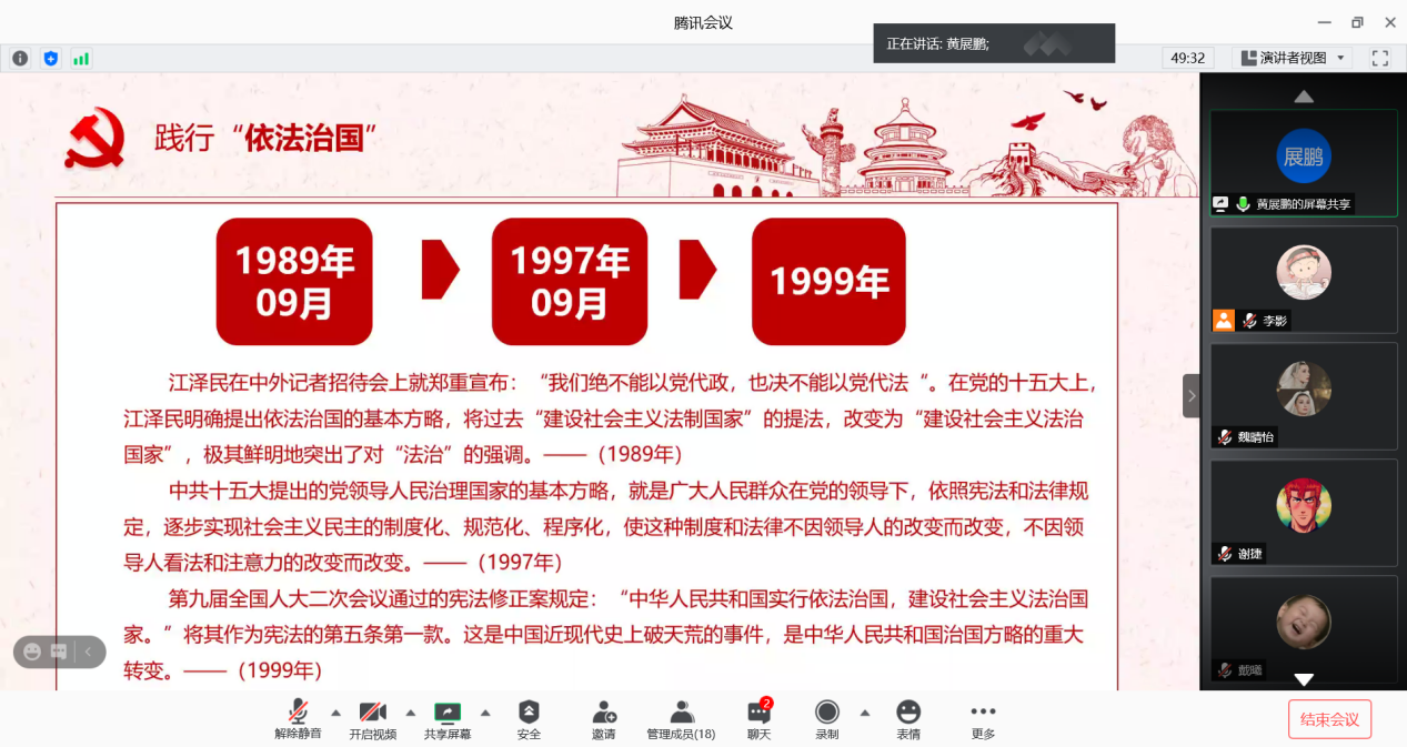 黄展鹏同志以时间为基础,介绍了1989年到1999年期间依法治国的发展历程,体现了“依法治国”的长期性,并号召各位党员同志和积极分子学法、守法、用法。
