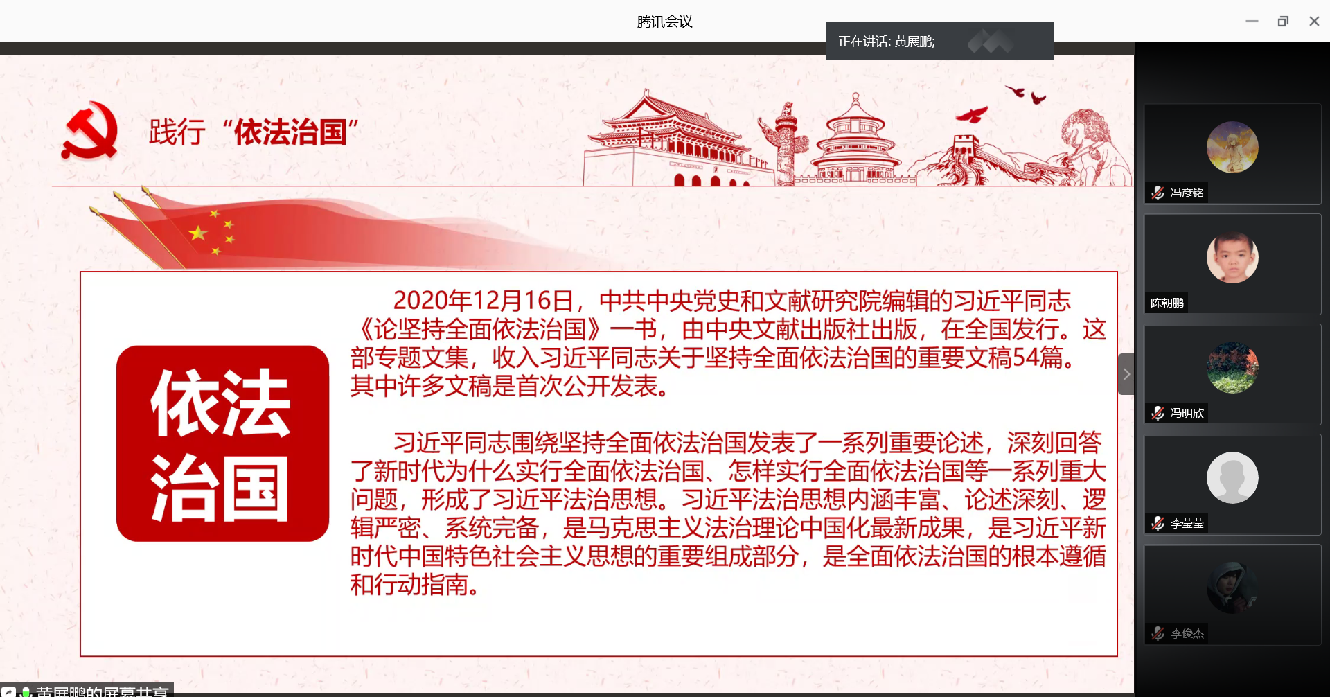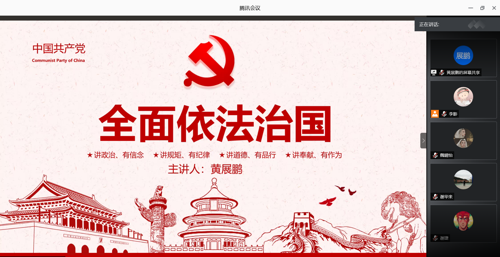 为响应“党十九大”中提出的《深化党和国家机构改革方案》,William威廉官网学生第一党支部第二小组的党员和入党积极分子于12月29日的晚21:00在线上开展了以“全面依法治国”为主题的学习分享会。