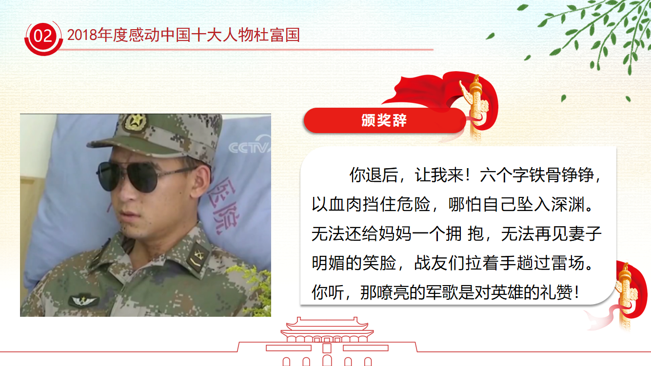 颁奖辞:你退后,让我来!六个字铁骨铮铮,以血肉挡住危险,哪怕自己坠入深渊。无法还给妈妈一个拥 抱,无法再见妻子明媚的笑脸,战友们拉着手趟过雷场。你听,那嘹亮的军歌是对英雄的礼赞!