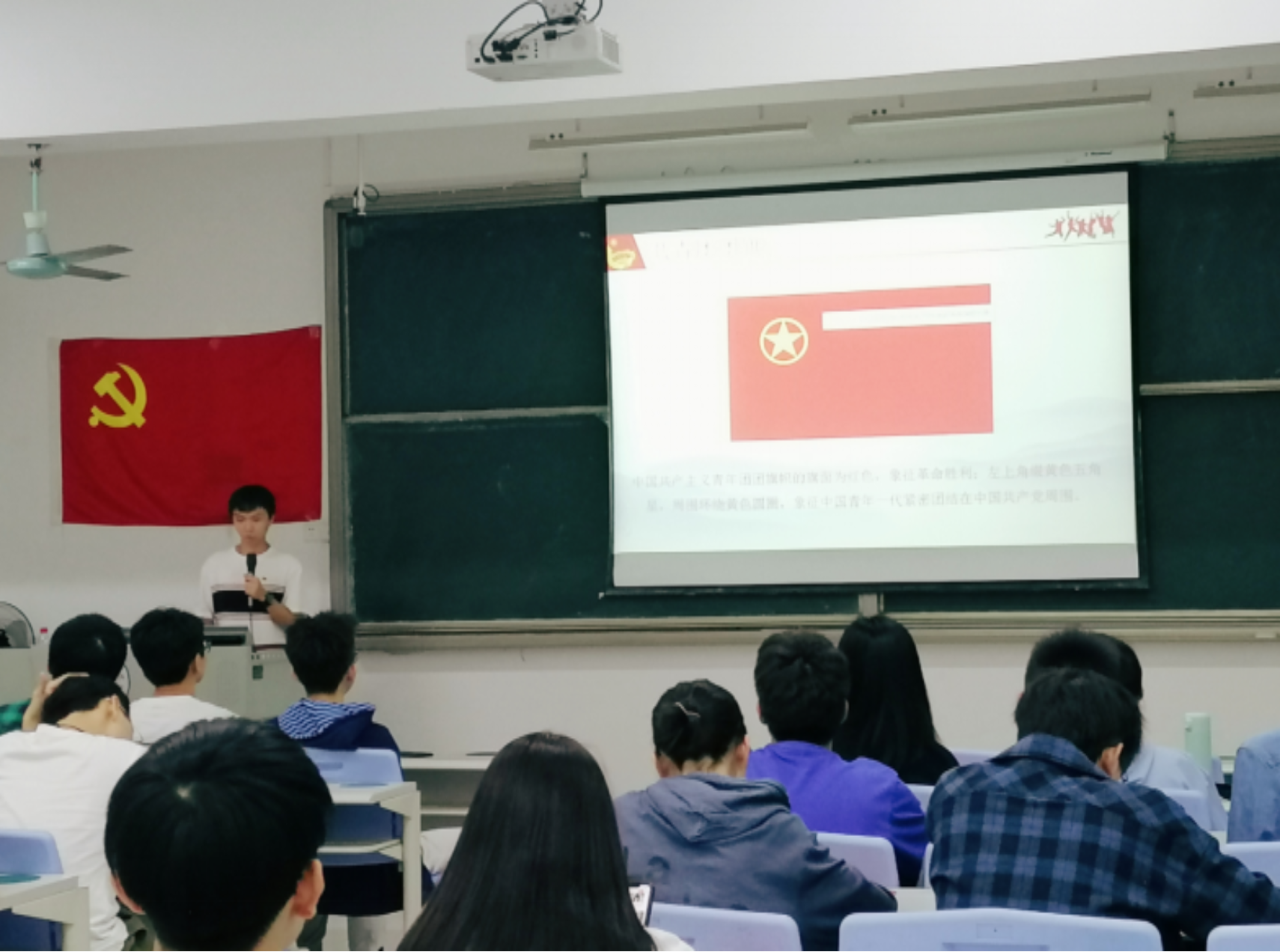 首先,黄展鹏同志给我们讲解了一些有关共青团的基础知识,并结合党章的内容和自身的经验,让大家进一步了解到党和团是紧密联系的。根据团旗的象征意义,我们可以了解到,中国共产主义青年团团旗帜的旗面为红色,象征革命胜利;左上角缀黄色五角星,周围环绕黄色圆圈,象征中国青年一代紧密团结在中国共产党周围,所以团和党密不可分,中国共产主义青年团是中国共产党的助手和后备军。