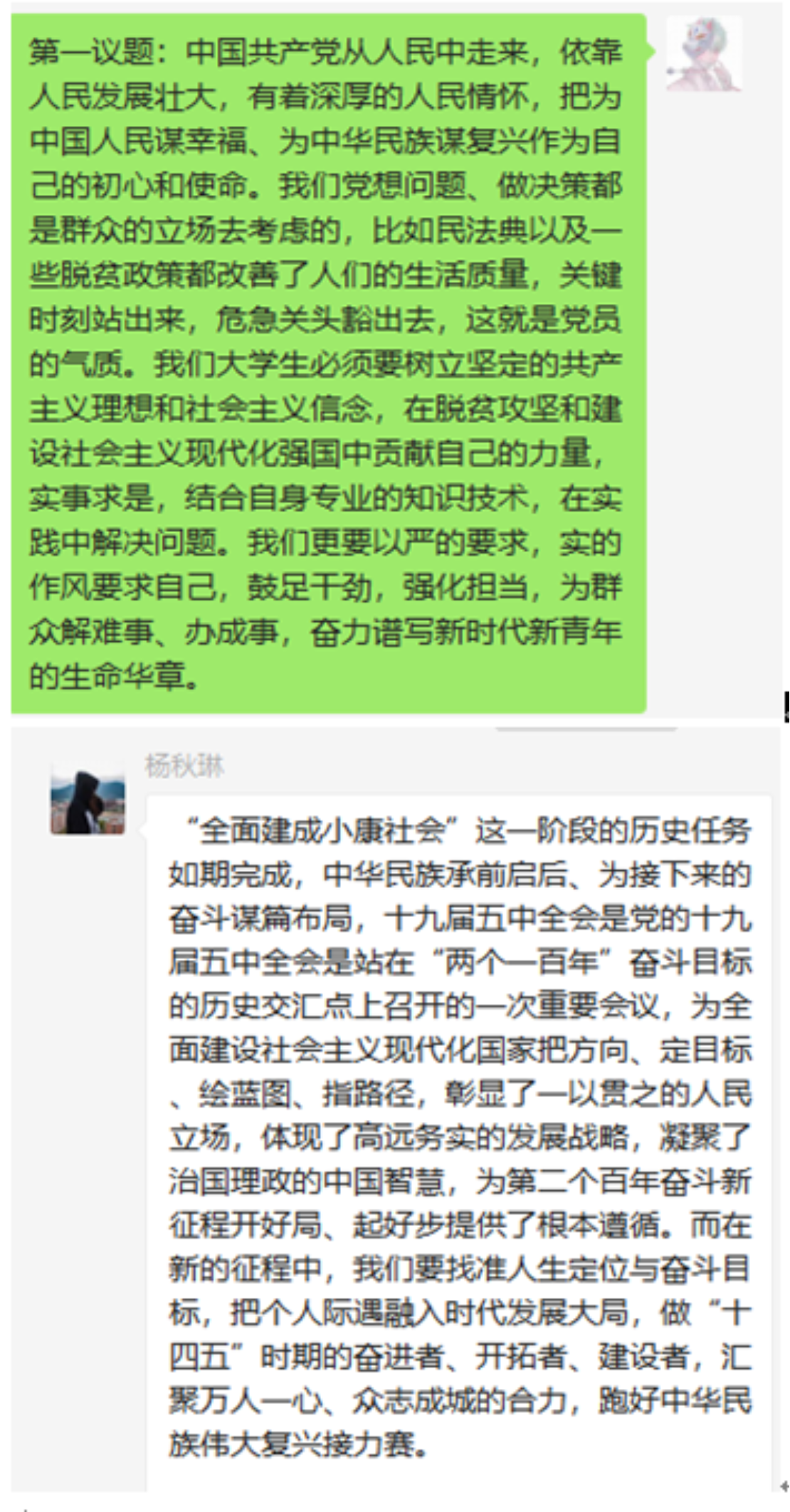 陈博正:首先,我作为17级的学生党员,这是第一次接触由党员上团课的活动,我知道团课的政治理念的内容较多,如果我们单纯对支部团员讲思想的话,团员很大可能接受不了,反而降低了我们团课的效果。我在第一节团课,就是大学生活和大学团支部的课程中,分享了两个关于要做规划的小故事,但仍不能引起支部团员的兴趣,我应该反思一下怎么才能上好团课,做到零睡觉,大氛围的效果呢。