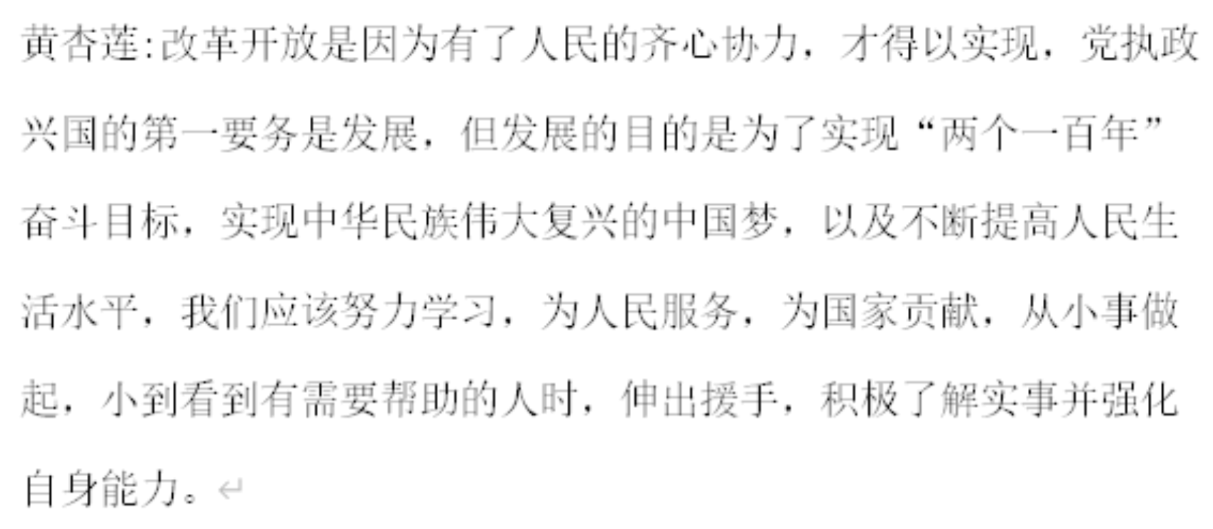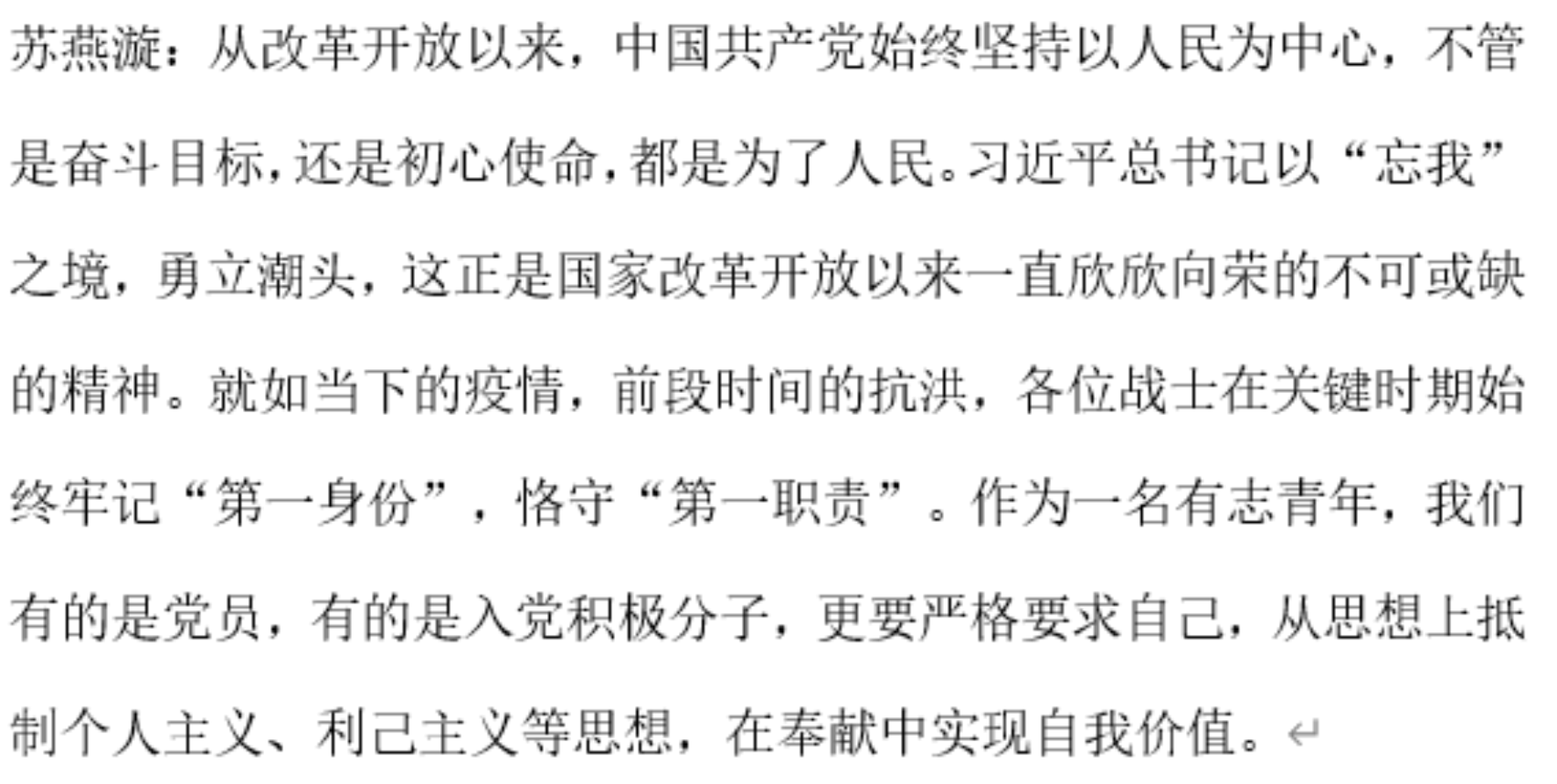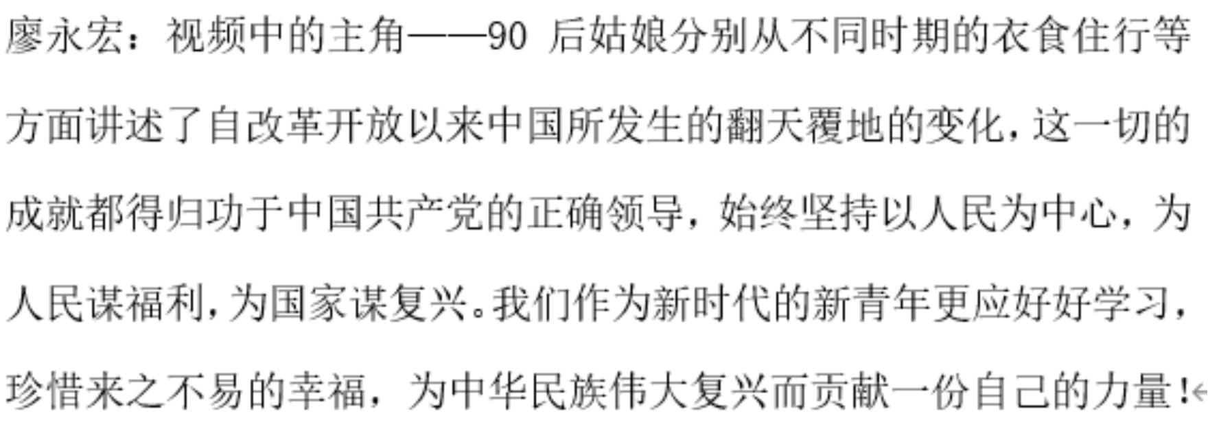90后姑娘分别从不同时期的衣食住行等方面讲述了自改革开放以来中国所发生的翻天覆地的变化,这一切的成就都得归功于中国共产党的正确领导,始终坚持以人民为中心,为人民谋福利,为国家谋复兴。我们作为新时代的新青年更应好好学习,珍惜来之不易的幸福,为中华民族伟大复兴而贡献一份自己的力量!