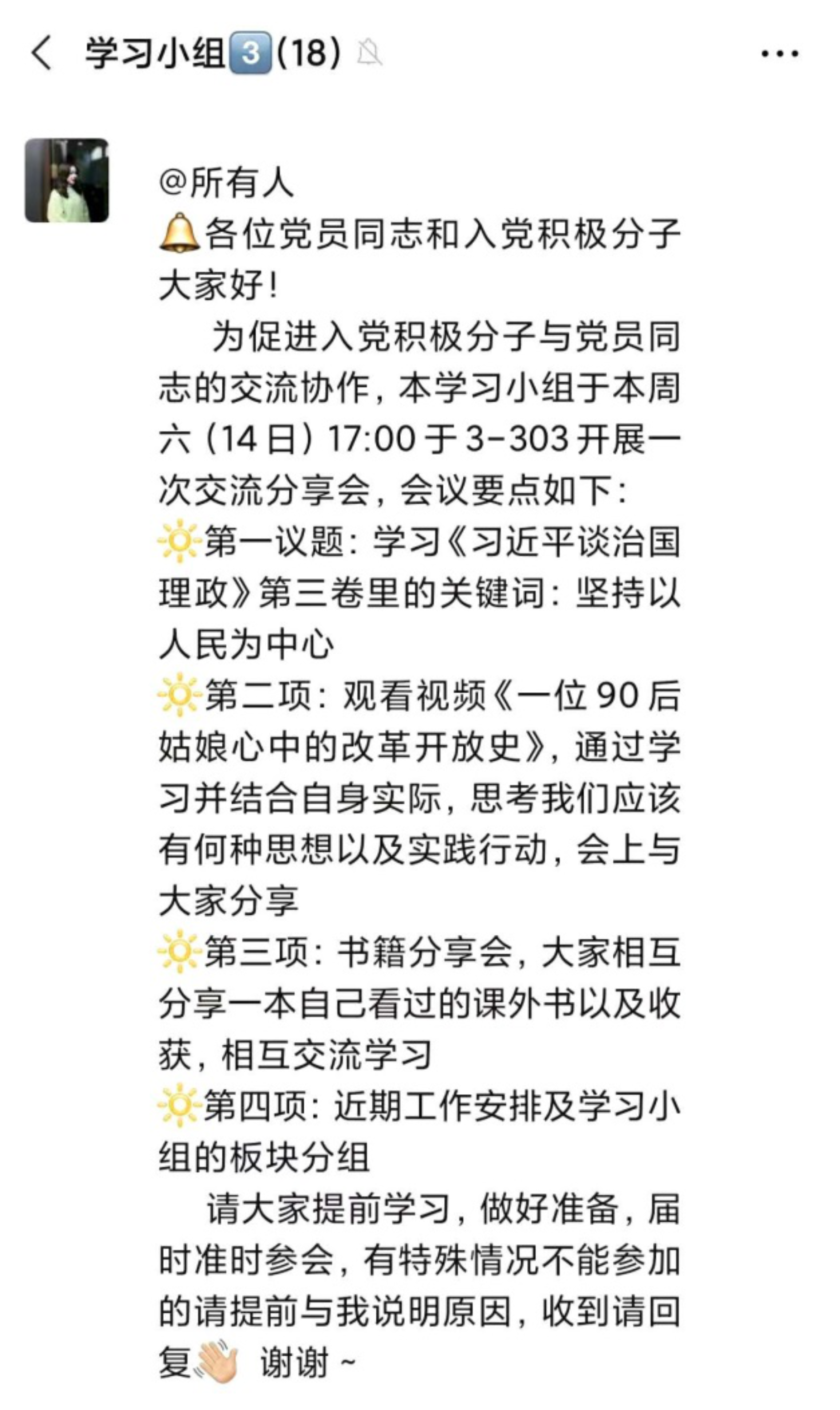 会议第三项,苏燕漩同志对党小组近期工作作了总结,首先是对新加入的入党积极分子表示欢迎,希望各位小伙伴能更快融入到学习小组的学习和活动中来,与其他同学一同进步。接着是对积极分子参与学习强国打卡的肯定,苏燕漩同志提到,希望各位积极分子能将学习强国当成每天学习的习惯,而非是任务。