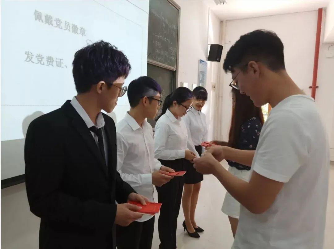 随后姜祥祥老师、刘丁嘉老师为新接收的预备党员们佩戴党员徽章、颁发党章与党费证。