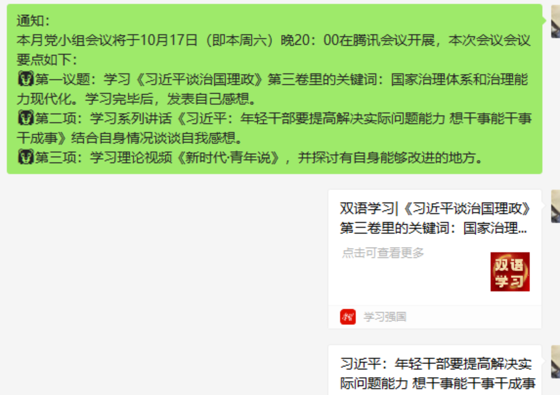 10月18日晚8点学生第三党支部第四党小组全体学生成员在腾讯会议平台上由谭梓健同志带领大家一起学习第一议题:《习近平谈治国理政》第三卷里的关键词:国家治理体系和治理能力现代化,并在学习完毕后,发表自己感想。