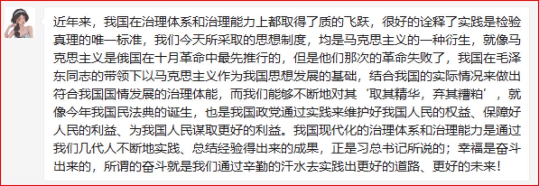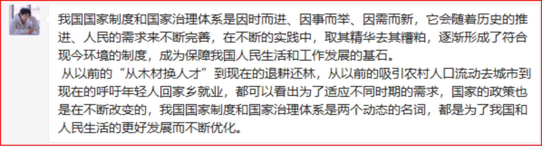 10月16日14:30,学生第三党支部第一党小组全体党员同志在盘晓云同志的带领下,学习了本月的第一议题的内容:《习近平谈治国理政》第三卷里的关键词:国家治理体系和治理能力现代化。习近平总书记在深化党和国家机构改革总结会议上强调,要认真总结深化党和国家机构改革取得的重大成效和宝贵经验,巩固机构改革成果,继续完善党和国家机构职能体系,推进国家治理体系和治理能力现代化。我们所学习的文章中的内容也是习总书记在中共十九届四中全会第二次全体会议上的讲话,结合这篇文章和自己的了解,大家都发表了各自的感想。