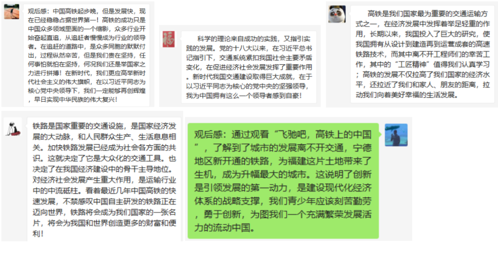接下来进行会议的第二项议程,观看“飞驰吧,高铁上的中国”的主题活动组织形式。党的十八大以来,习近平总书记提出建设交通强国的时代课题,高瞻远瞩、系统谋划,为交通运输发展指明方向。近年来,中国高铁坚持创新发展,实现了国产化与自主研发,建成了世界最现代化的高速铁路网;凭借强大的科研实力、高超的制造水平和过硬的技术标准,中国高铁在世界上独占鳌头。大家在感叹我国高铁飞速发展的同时,纷纷写下自己的观后感。