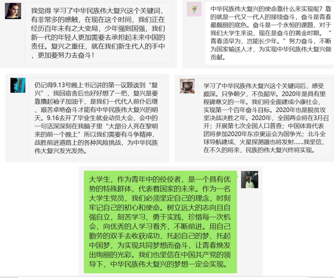 通过本次党小组会议的学习、活动及实习工作就业经验分享,我们从关键词中华民族伟大复兴中各有所思,但也各有所同。归根结底复兴离不开奋斗,我们每个人的奋斗,凝聚起来就是一个国家的复兴。环校跑虽在跑的中途下起了小雨,但跑步氛围很好,大家分享了一些自己上课学习或工作中的一些趣事,此次跑步很好的缓解了学习的压抑,也增进小组内成员的友情。丽敏同学的经验分享对于即将走向社会的我们是很有参考意义的,通过对如何找工作,薪资问题及公司选择问题的经验分享,扫除了我们心中的一些困惑与焦虑,对不久的将来更加充满信心。