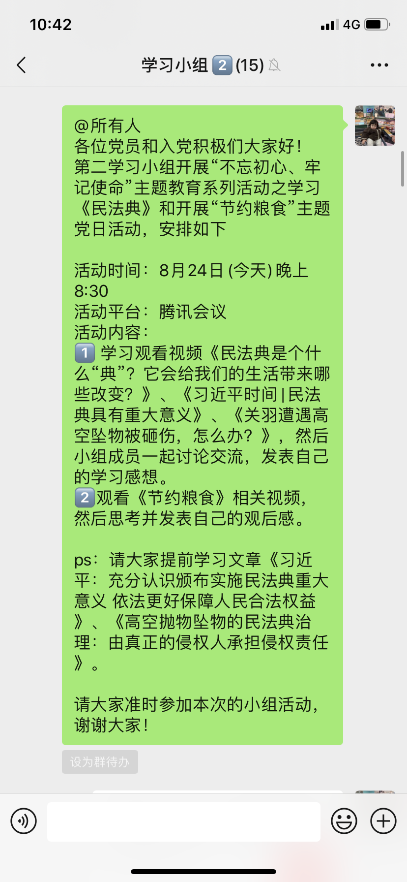 一粥一饭,当思来之不易。“节约粮食”是每个人不可推卸的一份责任,我们争做节约粮食的践行者,用实际行动参与到节约粮食的行动中来。为更好的贯彻习近平总书记关于“制止餐饮浪费”的重要指示精神,不断增强党员与积极分子珍惜粮食的良好意识,培养学生党员和积极分子勤俭节约的良好品德,William威廉官网学生第三党支部第二学习小组全体成员于8月24日20点30分在腾讯会议平台开展“拒绝舌尖上的浪费,从我做起!”的主题党日活动。