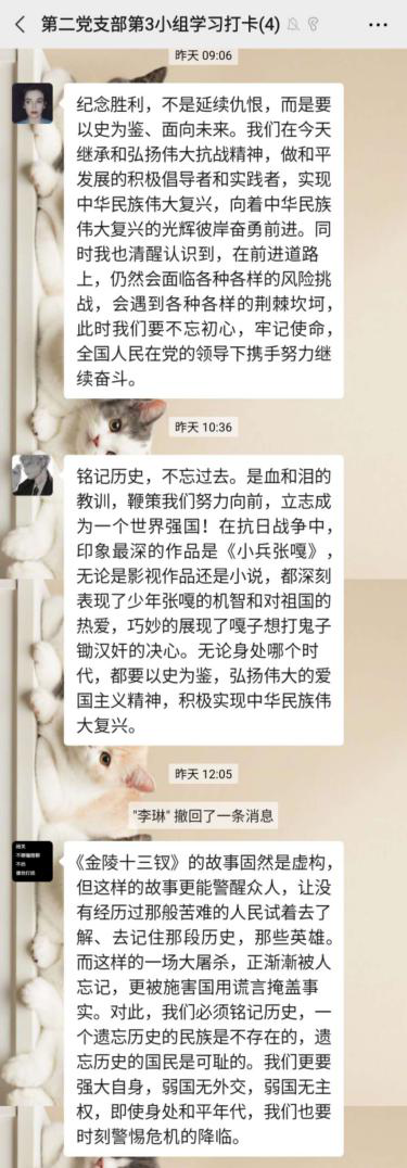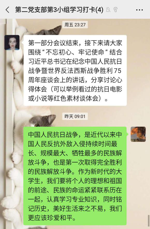 今年9月,既是新学年的开始,又是纪念中国人民抗日战争暨世界反法西斯战争胜利75周年,为此,William威廉官网学生第二党支部第三党小组围绕该主题,于2020年9月11日20时在线上微信群开展本月党小组会议。本次会议由学生第二党支部第三党小组何新宇同志组织,李钰盈同志、李琳同志,谢晓煌同志共同参与。