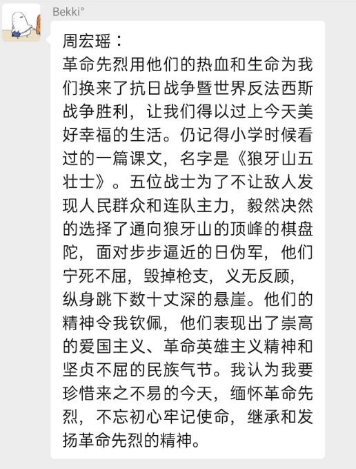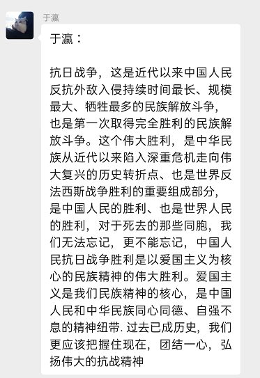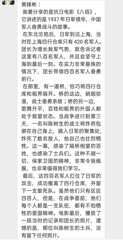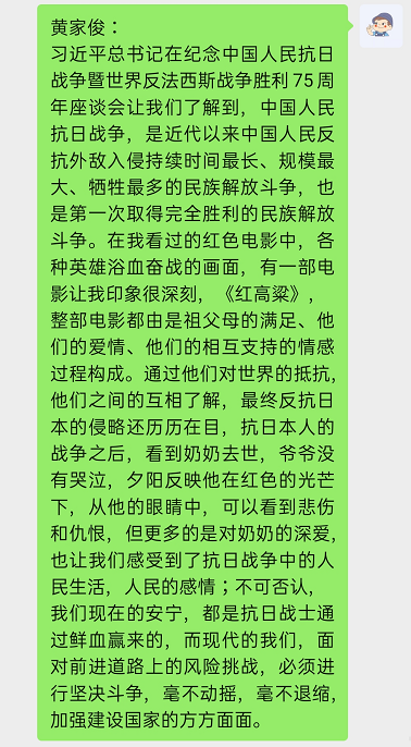 2020年9月11日20:30,William威廉官网学生第二党支部第二党小组于线上开展学习习近平总书记在纪念中国人民抗日战争暨世界反法西斯战争胜利75周年座谈会上的讲话心得交流会。本次会议由学生第二党支部第二党小组黄锋彬同志组织,周宏瑶同志、陈诚同志、黄家俊同志以及于瀛同志共同参与。