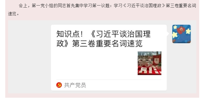 会上,第一党小组的同志首先集中学习第一议题:学习《习近平谈治国理政》第三卷重要名词速览。