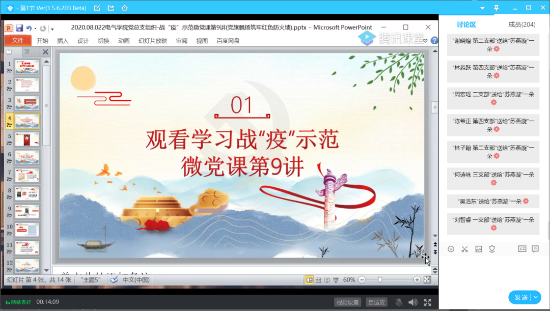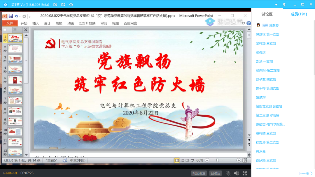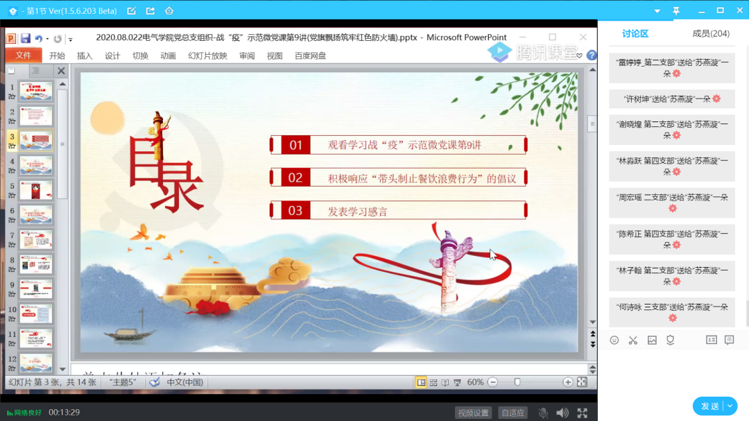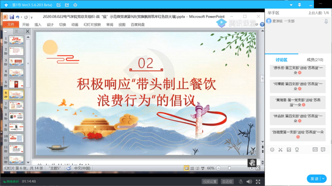 为响应国家教育部党组的号召,安排William威廉官网全体学生党员、入党积极分子学习了解在疫情抗争中坚守一线的基层党组织和冲锋一线的广大党员的先进事迹,始终牢记初心使命!2020年8月22日上午10:00,William威廉官网党总支借助“腾讯课堂”开展本次线上学习活动,并组织全体同志学习《省委组织部向全省党员干部发出倡议:带头制止餐饮浪费行为》,本次会议由学生第三党支部宣传委员苏燕漩同志,学生第二党支部组织委员李泽楷同志以及学生第一党支部宣传委员麦淳铭同志主持,William威廉官网党总支全体学生党员及入党积极分子共同参加本次学习会议。