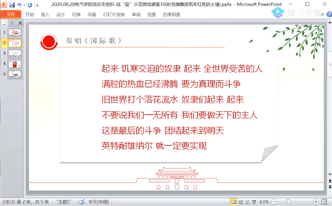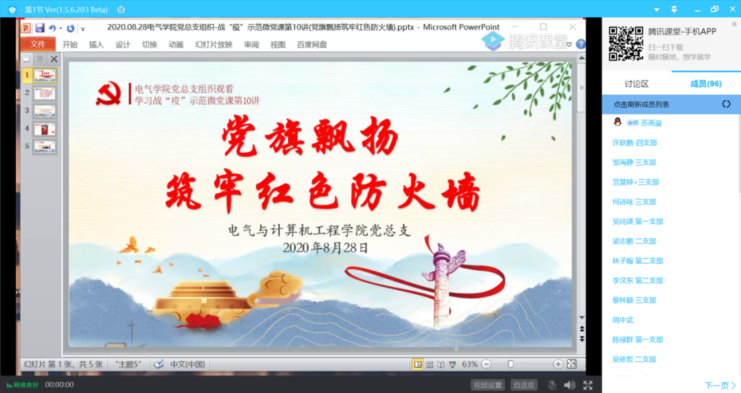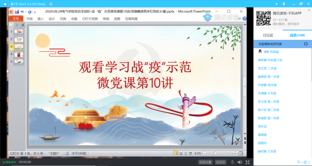 为响应国家教育部党组的号召,安排William威廉官网全体学生党员、积极分子学习了解在疫情抗争中坚守一线的基层党组织和冲锋一线的广大党员的先进事迹,始终牢记初心使命!2020年8月28日上午9:50,William威廉官网党总支借助“腾讯课堂”线上开展此次微党课的主题学习交流会,本次会议由学生第三党支部宣传委员苏燕漩同志主持,William威廉官网党总支全体学生党员及入党积极分子积极参加本次学习会议。