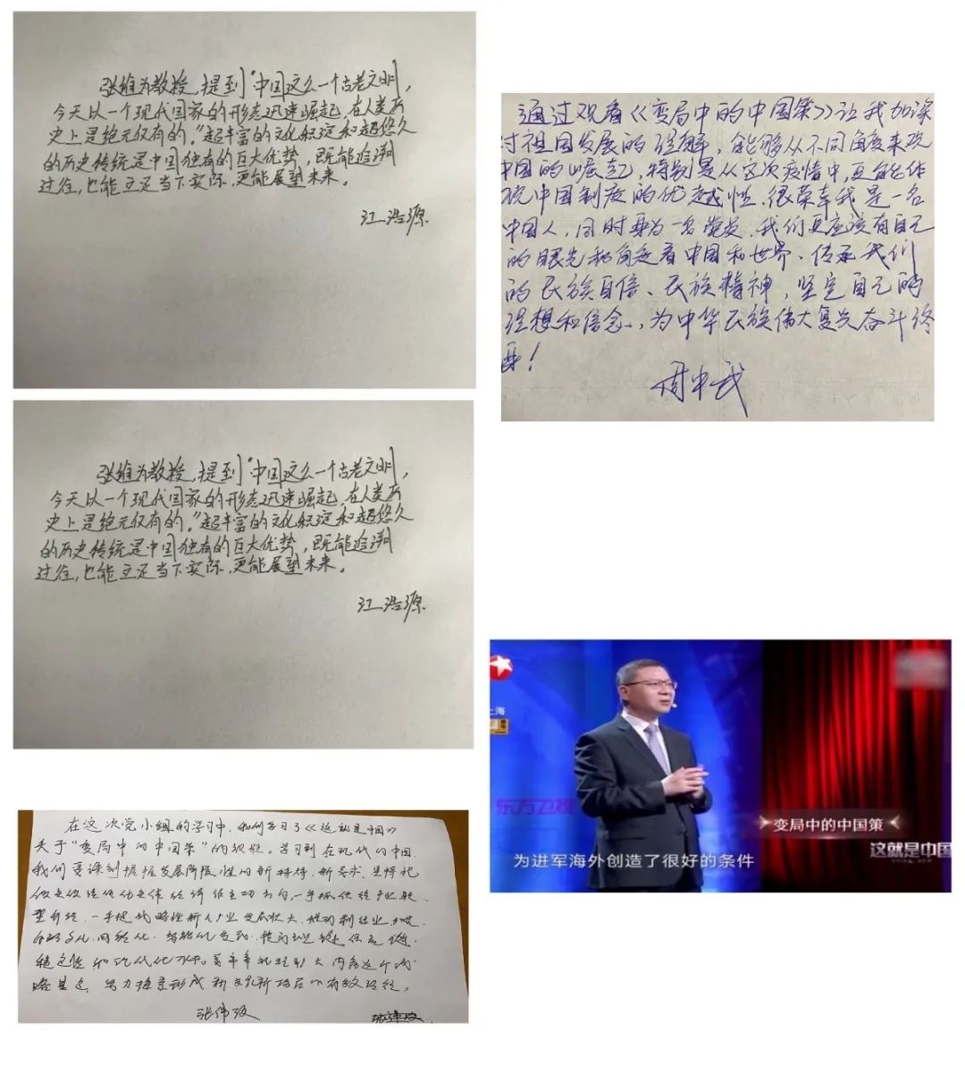 接下来进行会议的第二项内容,观看视频《变局中的中国策》并分享观后感,通过手写的方式。超悠久的历史传统与超丰富的文化积淀是中国独有的巨大优势,既能追溯过往,也能立足当下实际,更能展望未来。除此之外,超大型的人口规模与超广阔的疆域国土,提供广大深厚的地理与社会人文空间,营造一个纷繁复杂却和而不同的独特环境与文化。时间与空间的双层融汇交集,形成不同阶段、不同层面、不同时期的量变到质变的各种可能。