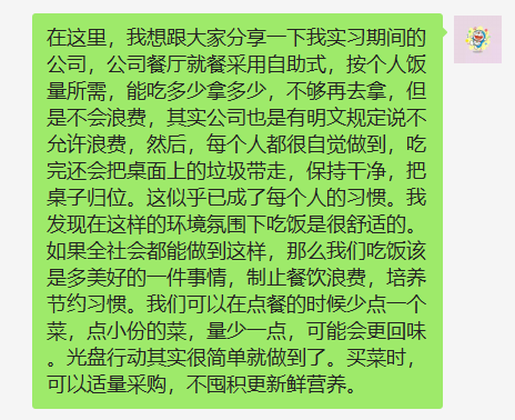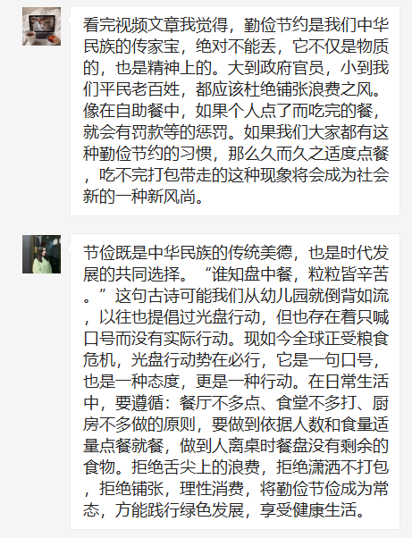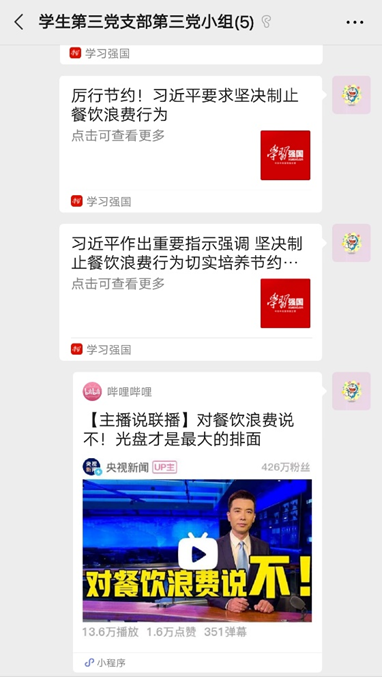 学习完《厉行节约!习近平要求坚决制止餐饮浪费行为》文章和观看了视频主播说联播《对餐饮浪费说不!光盘才是最大的排面》之后,学生第三党支部第三党小组纷纷发表了自己的感想,并在会议上作出讨论。
