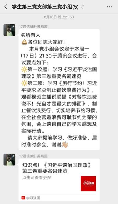 8月17日,学生第三党支部第三党小组全体成员在“腾讯会议”APP上开展党小组会议, 集体学习《习近平谈治国理政》第三卷重要名词速览,这本书是全面系统反映习近平新时代中国特色社会主义思想的权威著作,对于推动广大党员、干部和群众学懂弄通做实习近平新时代中国特色社会主义思想具有重要意义。