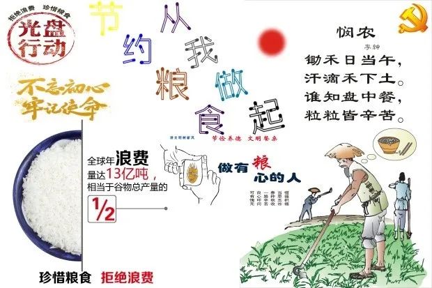 黎梓颖:由古至今,节约粮食,拒绝浪费一直是国人的传统美德,在古代就有“谁知盘中餐,粒粒皆辛苦“的歌谣传唱,也有‘一斤粮,千粒汗,省吃俭用细盘算’的口头禅等等……随着社会的进步,国家的兴旺,人们的物质生活水平提升了,许多家庭都过着饭饱酒足的生活,但是浪费粮食的情况却普遍可见,曾有数据统计,全球粮食年浪费量达13亿吨,相当于产值的二分之一,如此庞大的数据,我们不得不警惕自己,做一个有“粮”心的人,珍惜粮食,拒绝浪费,节俭养德,文明餐桌。对于浪费粮食的热潮,有青年兴起了光盘行动,这也是珍惜粮食的表现,作为新时代的我们更应加入光盘行动,珍惜粮食,拒绝浪费,树立文明餐饮,道德饮食的良好氛围。