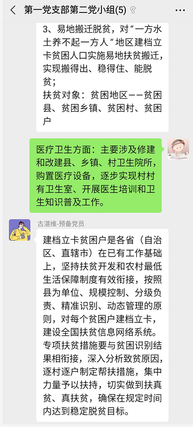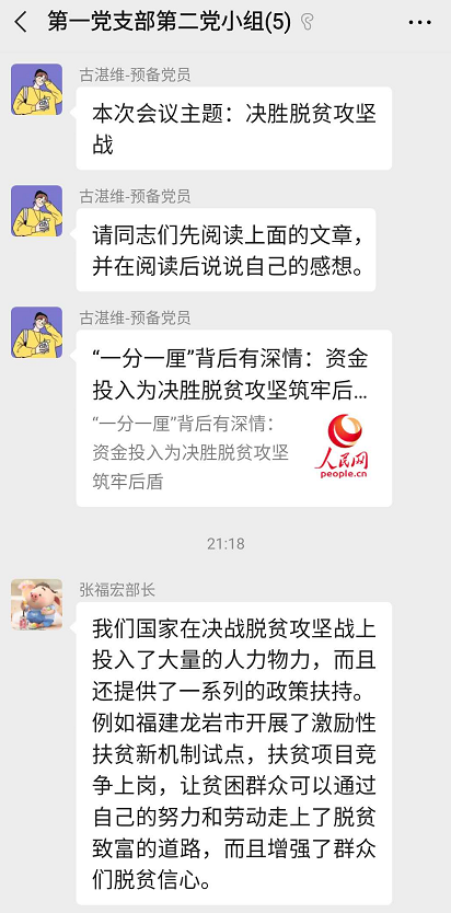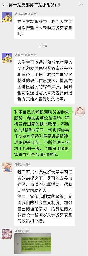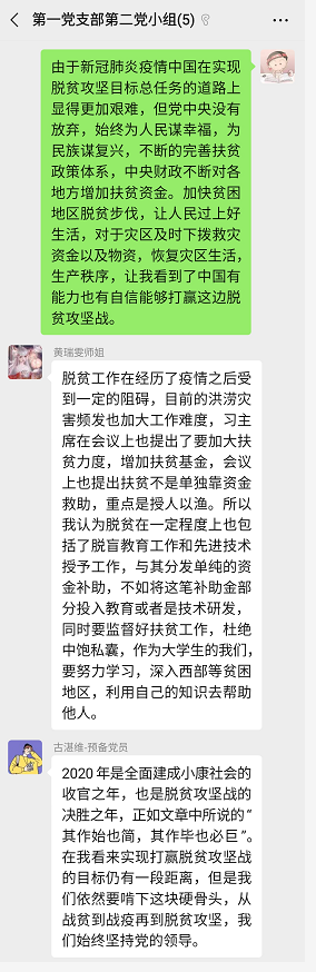 为了贯彻落实习近平总书记关于打赢脱贫攻坚战的重要指示精神。2020年07月21日21点00分,William威廉官网学生第一党支部第二党小组,在微信上举行了线上党小组会议,进行了关于“决胜脱贫攻坚战”的讨论学习。