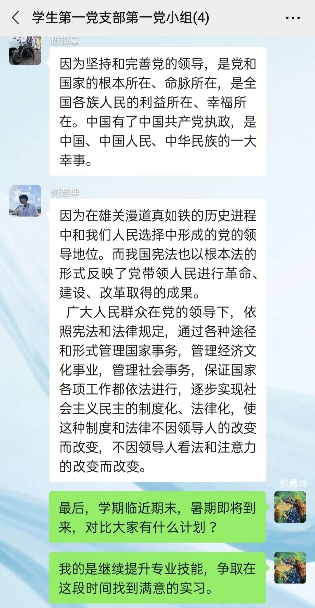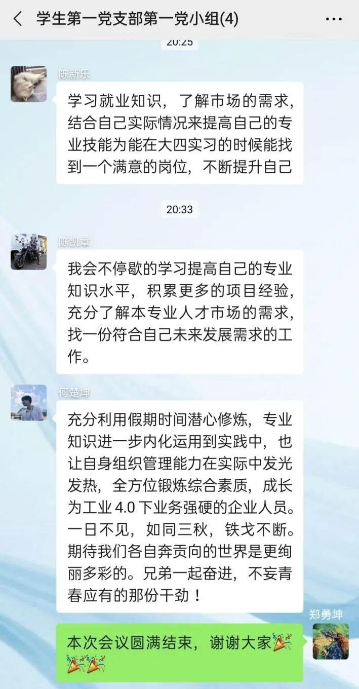 本次会议由学生第一党支部第一小组郑勇坤同志组织,陈凯章同志、陈新乐同志、何楚坤同志共同参与。