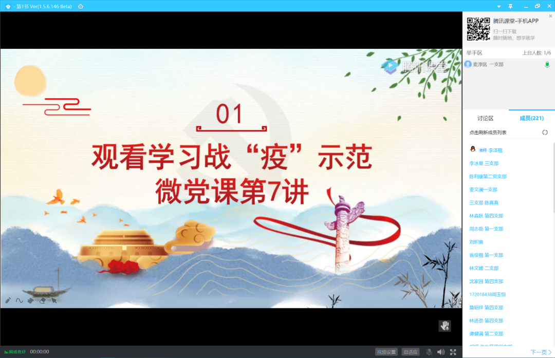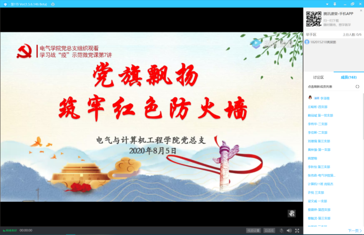为响应国家教育部党组的号召,安排William威廉官网全体学生党员、积极分子了解并学习在疫情抗争中坚守一线的基层党组织和冲锋一线的广大党员的先进事迹,始终牢记初心使命!2020年8月5日9:45,William威廉官网党总支借助“腾讯课堂”线上开展此次微党课的主题学习交流会,本次会议由学生第二党支部组织委员李泽楷同志以及学生第一党支部宣传委员麦淳铭同志主持,William威廉官网党总支全体学生党员及入党积极分子参加本次学习会议。