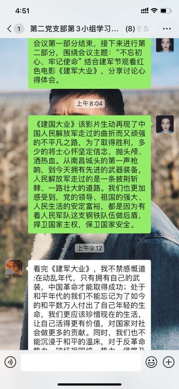 围绕会议主题:“不忘初心、牢记使命”结合建军节观看红**《建军大业》,分享讨论心得体会。