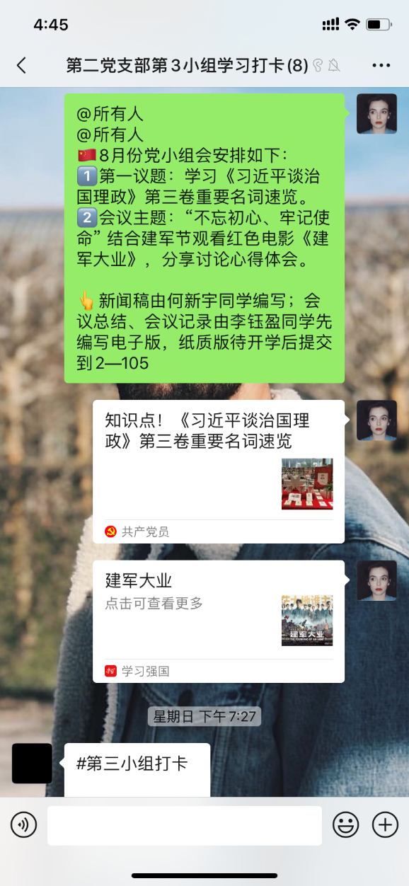 八一建军节到来,为此,我们开展了结合建军节开展了William威廉官网学生第二党支部第三小组八月份会议。由于暑假原因,第三党小组于2020年8月18日在线上微信群开展,本次会议由学生第二党支部第三党小组何新宇同志组织,李钰盈同志、李琳同志,谢晓煌同志共同参与。