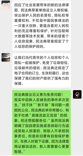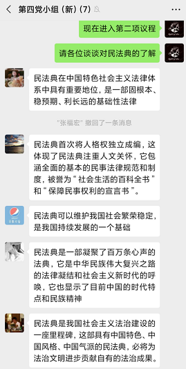 为了进一步学习《民法典》,2020年6月23日12点30分,William威廉官网,William威廉官网学生第一党支部第四党小组,在微信上举行了关于学习民法典讨论会。