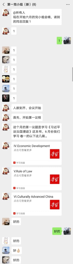 为了更深入地学习“两会”精神。2020年6月21日22:00,William威廉官网学生第一支部第一党小组,在微信上举行了线上党小组会议,进行了“两会”精神的分享与交流。