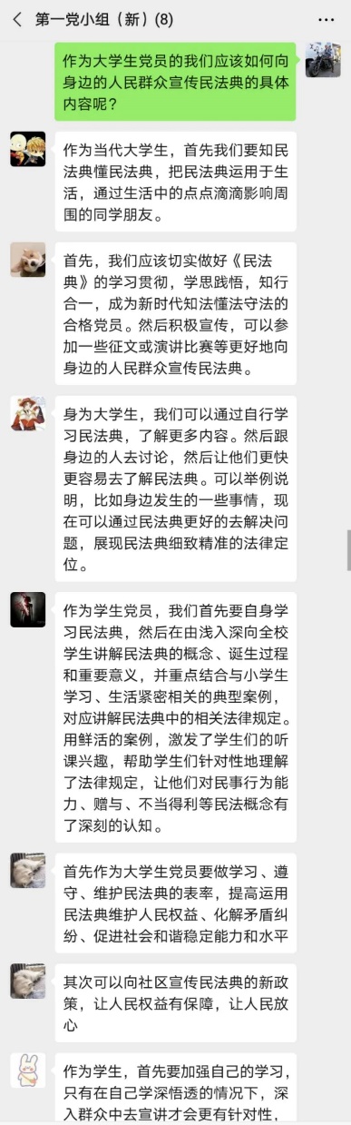 最后,大家一起讨论了作为大学生党员的我们应该如何向身边的人民群众宣传民法典的具体内容。