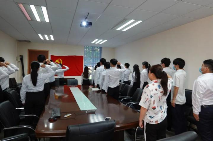 首先,在领誓人麦淳铭同志的带领下,30名新党员胸前佩戴党员徽章,站在鲜红的党旗下,右手握拳、庄严宣誓。掷地有声的誓言是每位新党员的承诺,也是他们前进的方向。