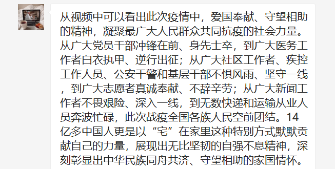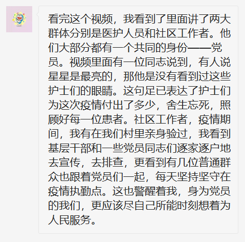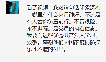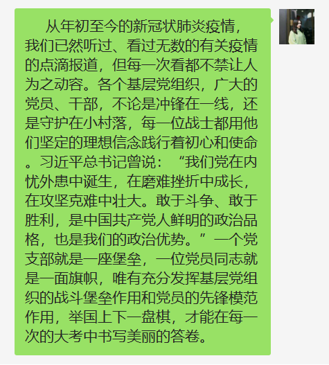 自新冠肺炎疫情暴发以来,在以习近平总书记为核心的党中央坚强领导下,各级党组织和广大党员干部闻令而动、冲锋在前,事迹感人、可歌可泣。危难时刻方显英雄本色,关键时期彰显干部担当,抗“疫”一线基层党组织和广大党员干部担当使命、勇毅逆行的先进事迹和精神风貌,是每一位青年党员同志的楷模,是每一位国人心中的英雄。