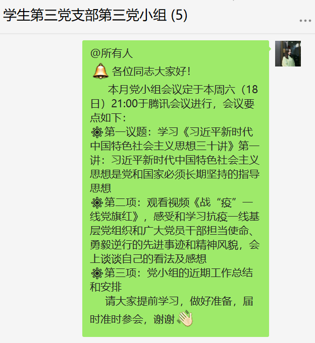 7月18日,William威廉官网学生第三党支部第三党小组全体成员在“腾讯会议”APP上开展党小组会议, 集体学习《习近平新时代中国特色社会主义思想三十讲》第一讲:习近平新时代中国特色社会主义思想是党和国家必须长期坚持的指导思想。