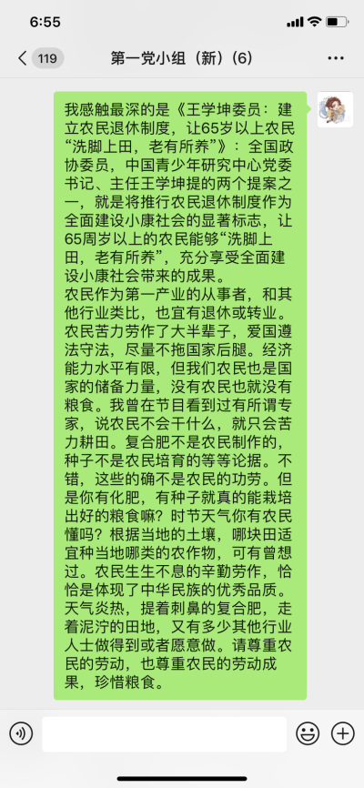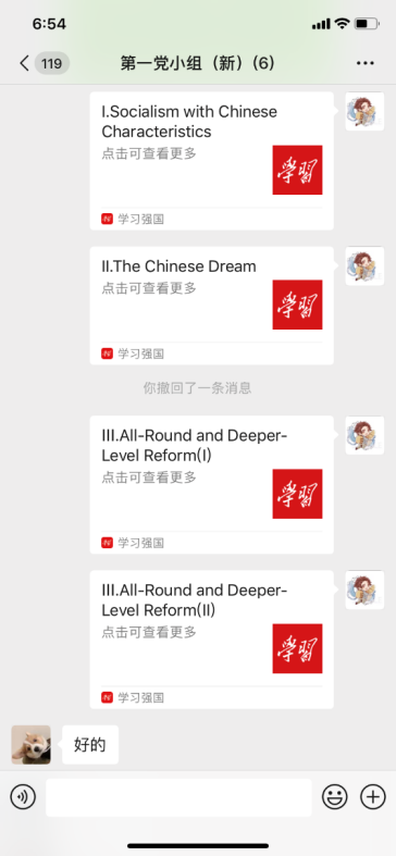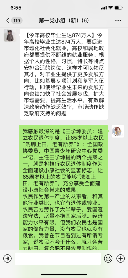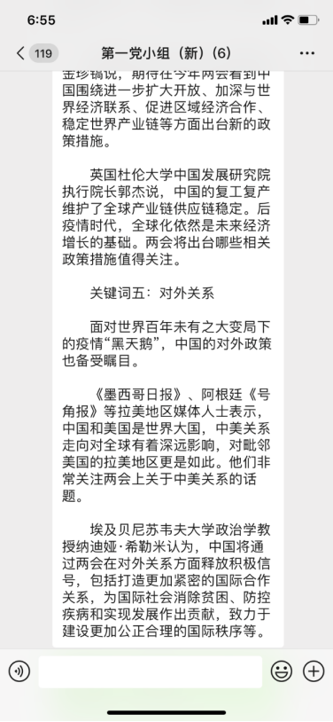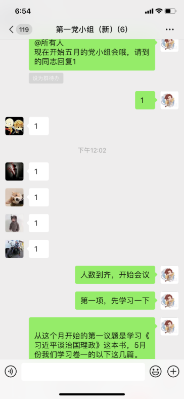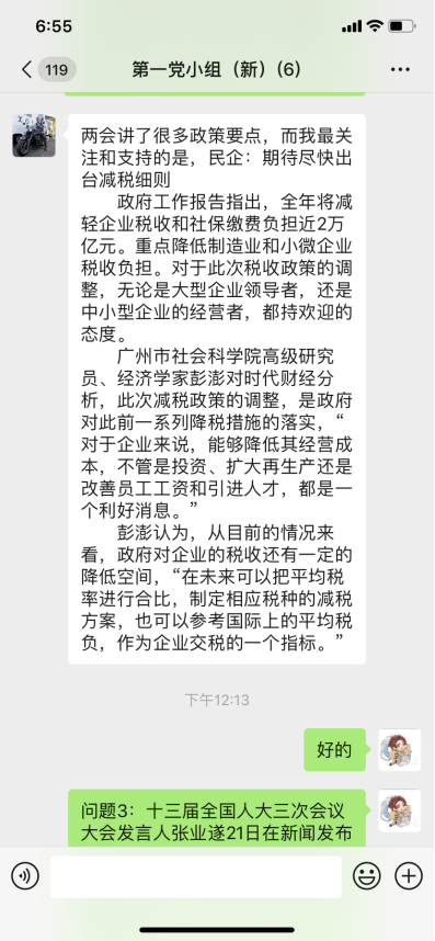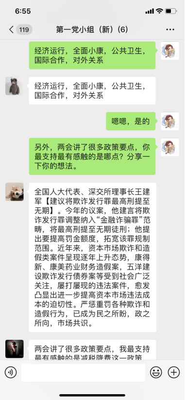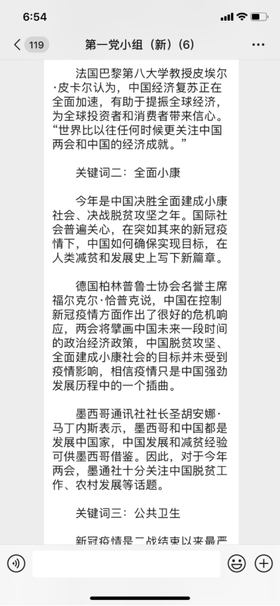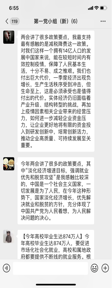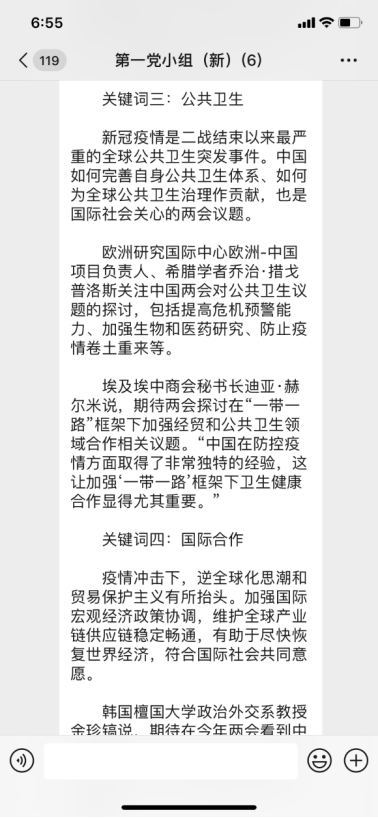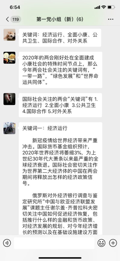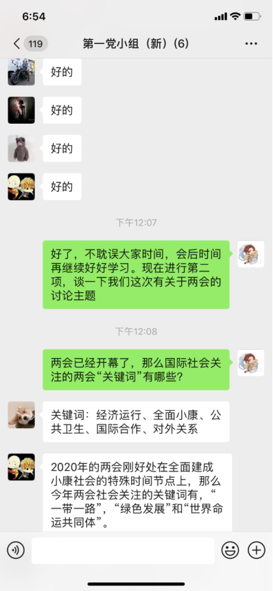为了更好地学习“两会”精神,2020年5月22日12:00,William威廉官网学生第一支部第一党小组,在微信上举行了线上党小组会议,进行了“两会”精神的分享与交流。