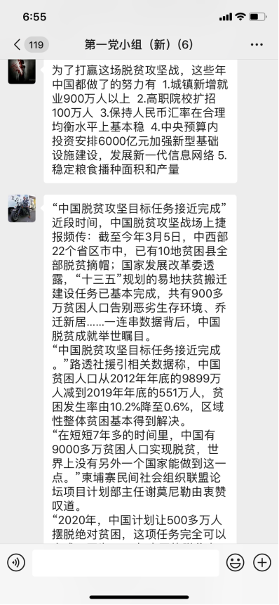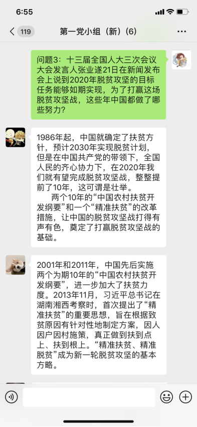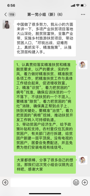 最后,大家一起讨论了国家为了打赢脱贫攻坚战都做了哪些工作,同志们都纷纷发表了自己的看法。