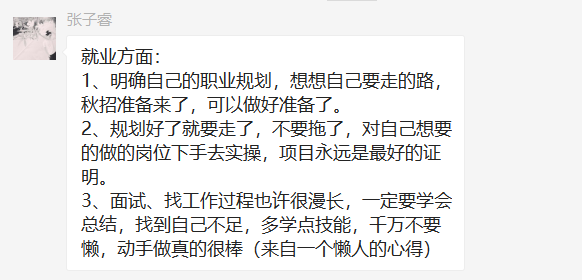 张子睿同志分享了就业方面的经验,认为需要明确自己的职业规划,不轻易更换目标,学会自我总结,找到自己的不足完善自己,不能懒惰要多实践。