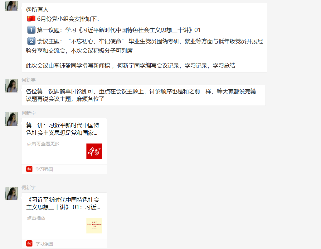 本次会议由学生第二党支部第三党小组何新宇同志组织,李钰盈同志、李琳同志、张子睿同志、何林婷同志、吴泽琼同志、谢晓煌同志、 陈婉铃同志共同参与。