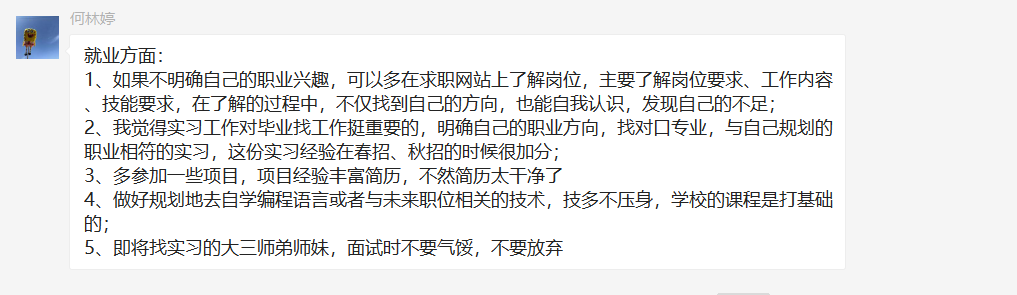 何林婷同志分享了就业方面的经验,认为求职时最好是提前规划了解好,没有目标的时候可以多了解多认知,努力去找总有适合自己的方向,且可以发现并且完善自身的不足;要自信去面对面试,相信自己的能力。还在学校学校的时候多参加项目,增加自己阅历和能力。