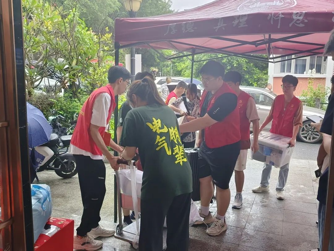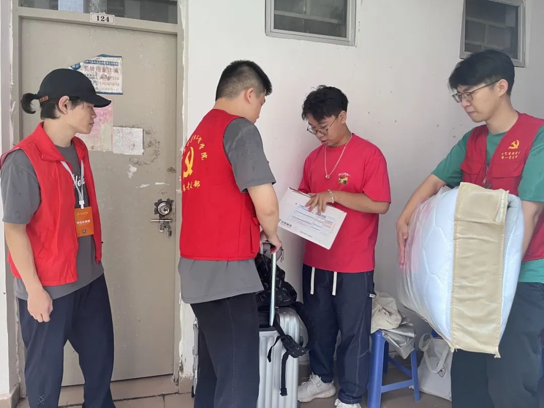 身穿红色马甲的志愿者们热情引导每一位新生办理入学手续,帮助新生搬运行李,为他们指路及答疑解惑,也有志愿者带领新生参观校园,介绍教学楼、图书馆等重要场所,帮助他们熟悉环境。
