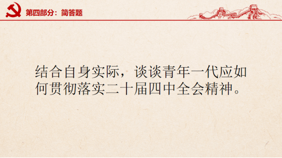 在最后的简答题论述中,党员同志分三点说明青年要做到的“三个扎根”,以行动践行初心使命。第一要扎根思想铸忠诚,把握信念。第二要扎根时间勇担当,当好行动的前沿。第三要扎根岗位善作为,青年党员更要立足本职勇挑重担。