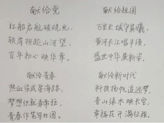 “以三行短句,赴一场与党和祖国的约定”。在三行诗创作板块,同志们以精练的文字、饱满的情感,表达爱党爱国爱社会主义的赤诚之心一首首诗歌或手写拍照或制成精美电子卡片,形式新颖、创意十足。文字虽短,却承载着青年党员的理想抱负,展现了新时代青年与党同心、与国同行的精神风貌。